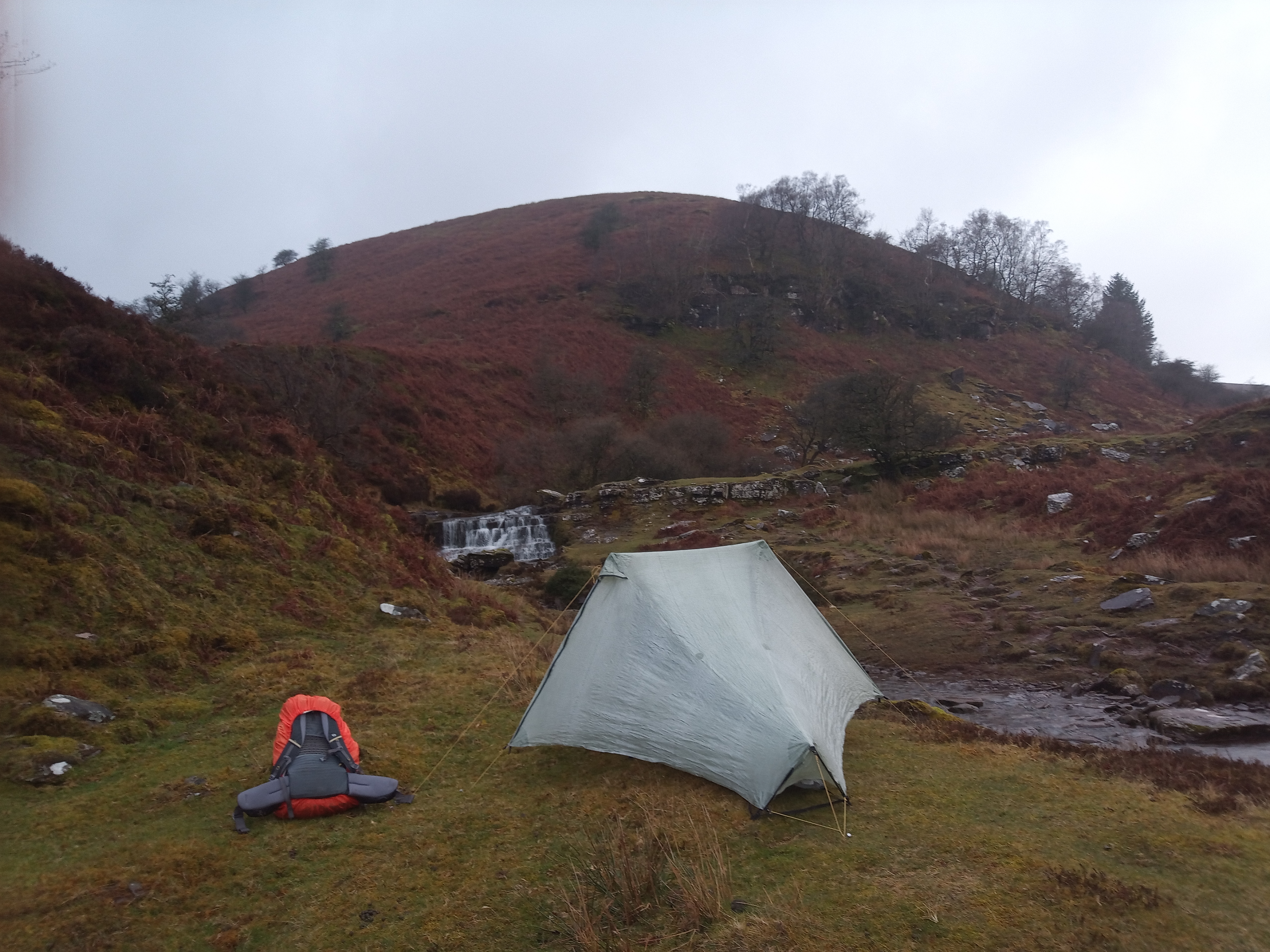 The wind was very strong, blowing the rain into all my nooks and crannies. I decided to head up the valley to try and find a sheltered spot to pitch, found a great spot but the shelter was doubtful, being optimistic I stuck the tent up in a lull.